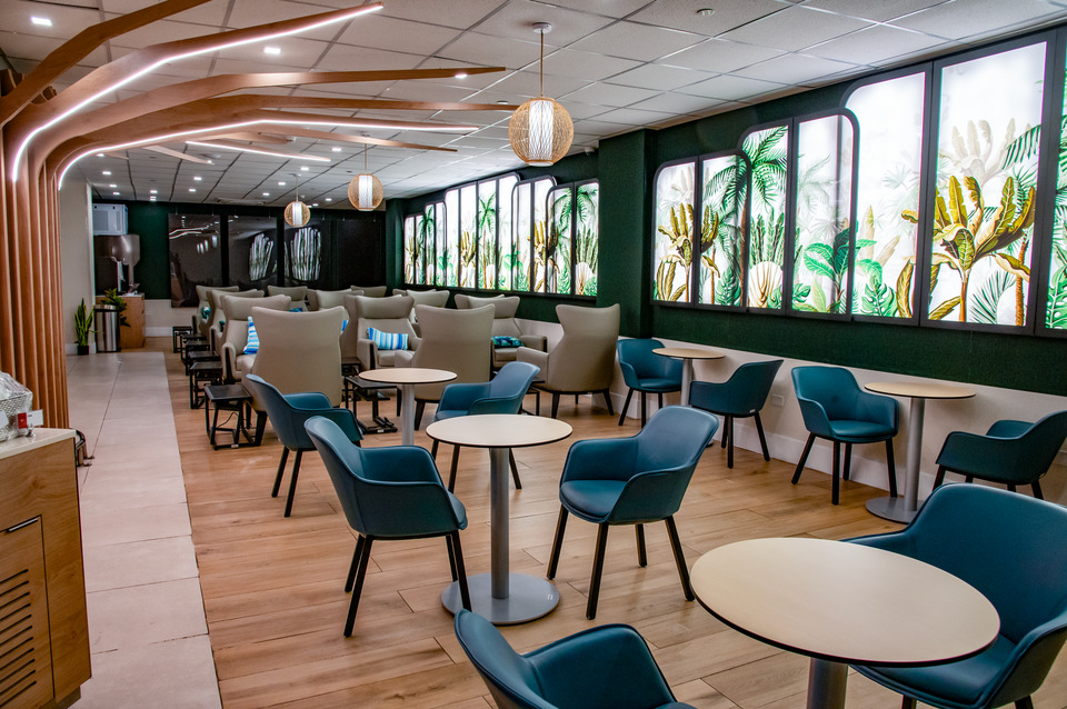 The lounges now feature new seating options, including spacious banquettes for groups and four-person armchairs with clear views of the runway.